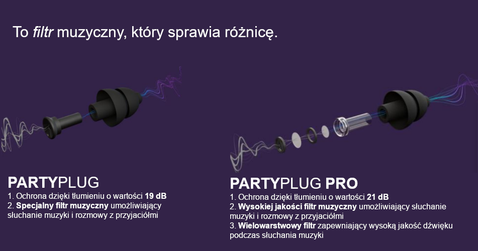 Dla najbardziej wymagających powstał PartyPlug Pro – zatyczki z zaawansowanym filtrem premium (SNR 21 dB), który nie tylko chroni przed szkodliwym hałasem, ale także zapewnia pełne, wysokiej jakości brzmienie muzyki.